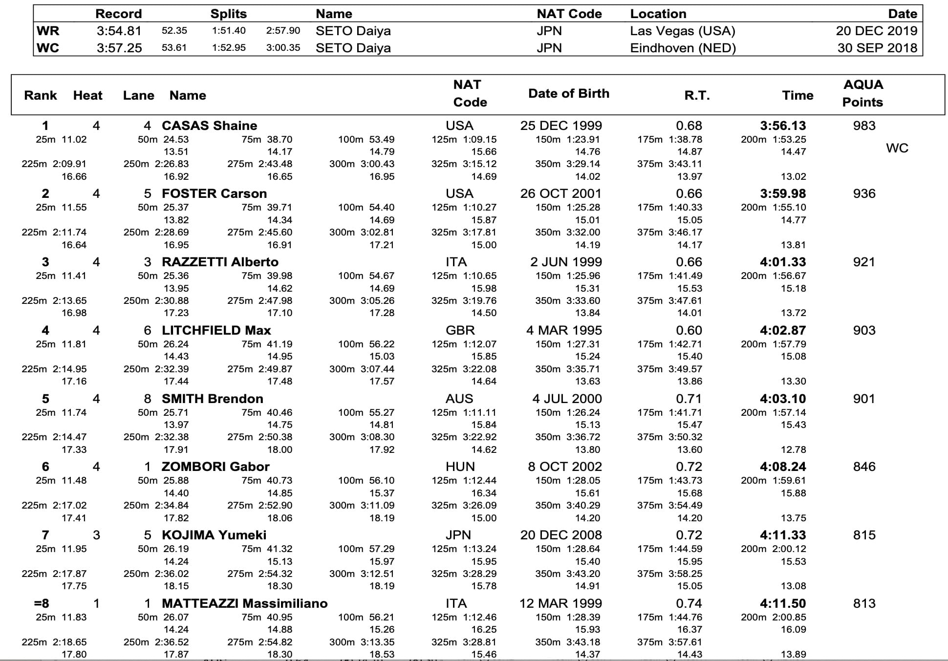 - 3:56.13 - 400m medley, Shaine Casas (USA), who took down the 3:57.25 that had stood to Japan's Daiya Seto since 2018. Seto owns the World record still: in 3:54. 81 from 2019.