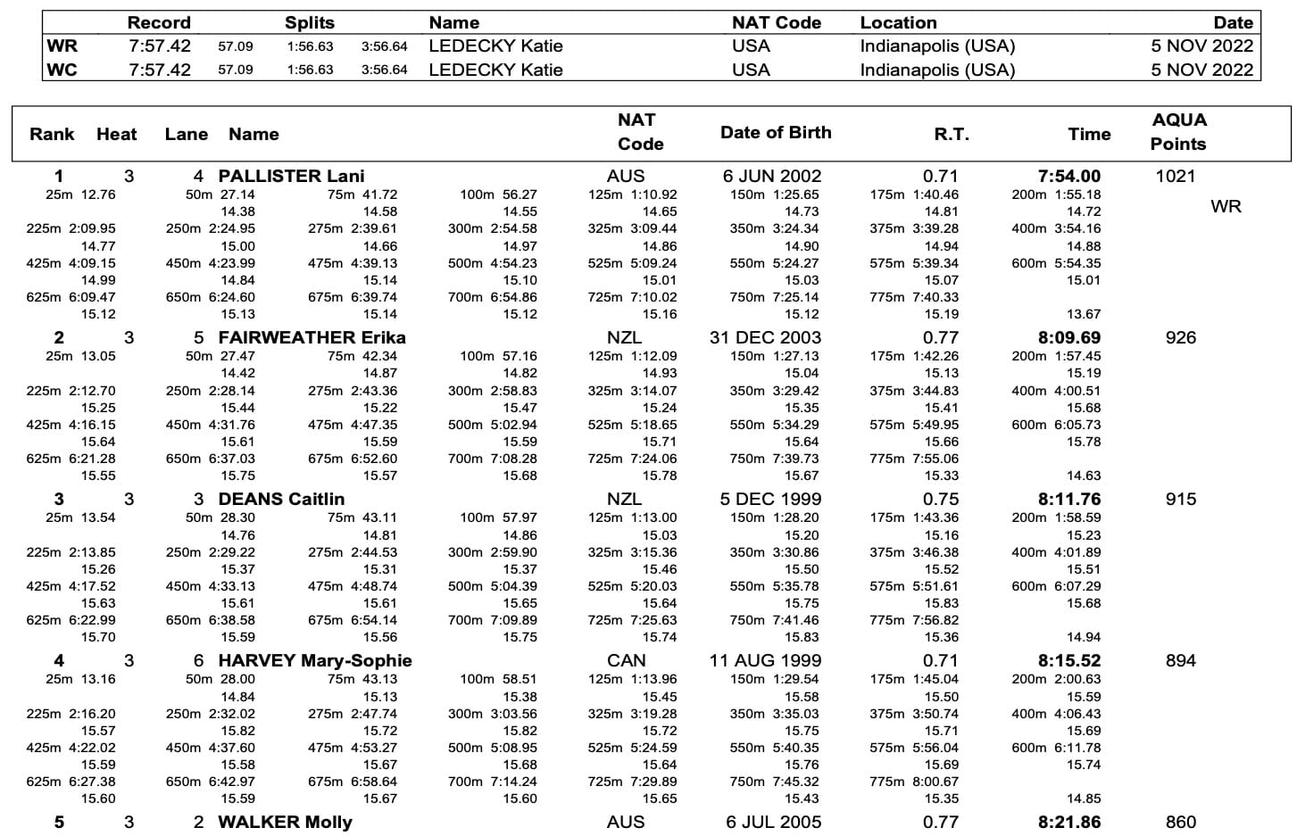 - 7:54.00 - 800m freestyle, Lani Pallister (AUS) wiping more than three seconds off Katie Ledecky's 2022 standard - Final No2