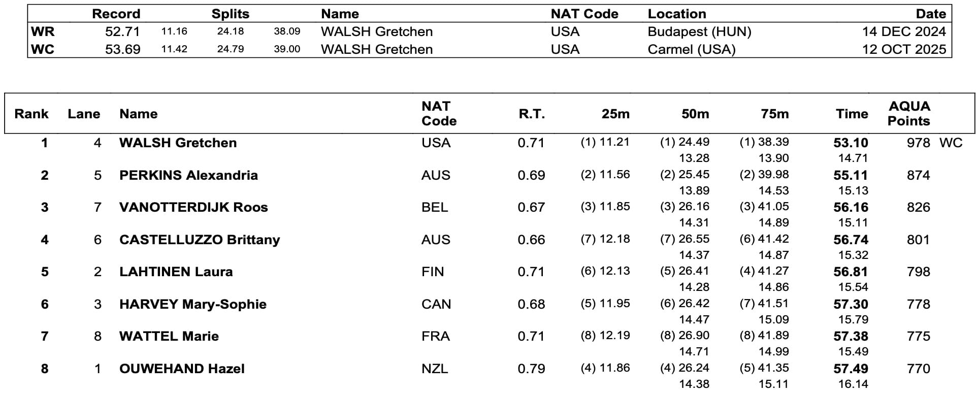 - 53.10 - 100m butterfly, Gretchen Walsh (USA), who wiped out the 53.69 Cup standard she set at round 1 of the 2025 tour two weeks ago, rattling her own scorching 52.71 World record, set for the global s/c championships crown in Budapest last December.