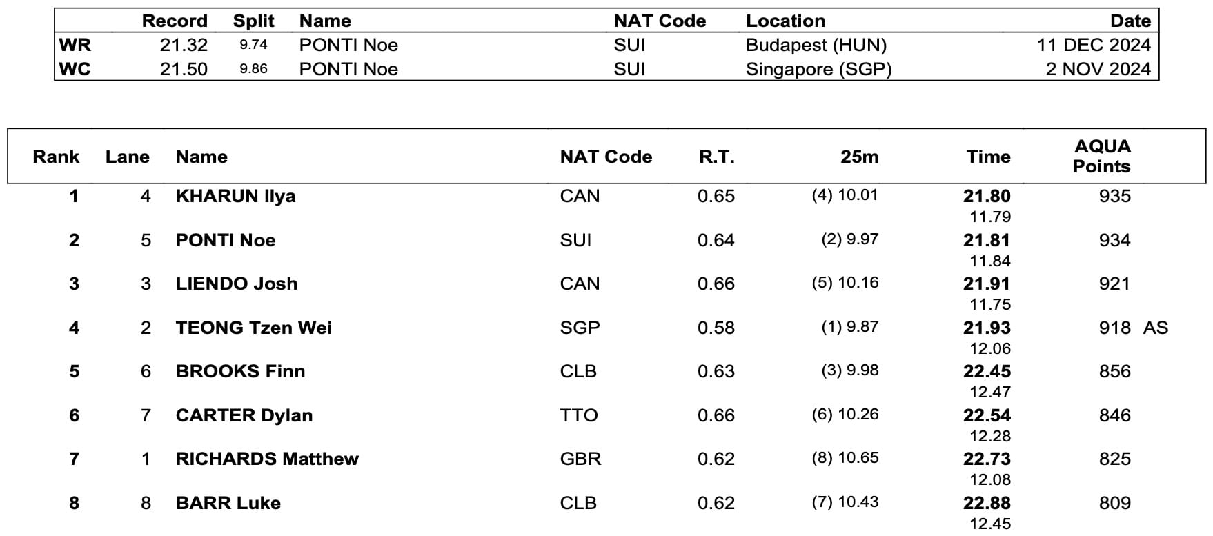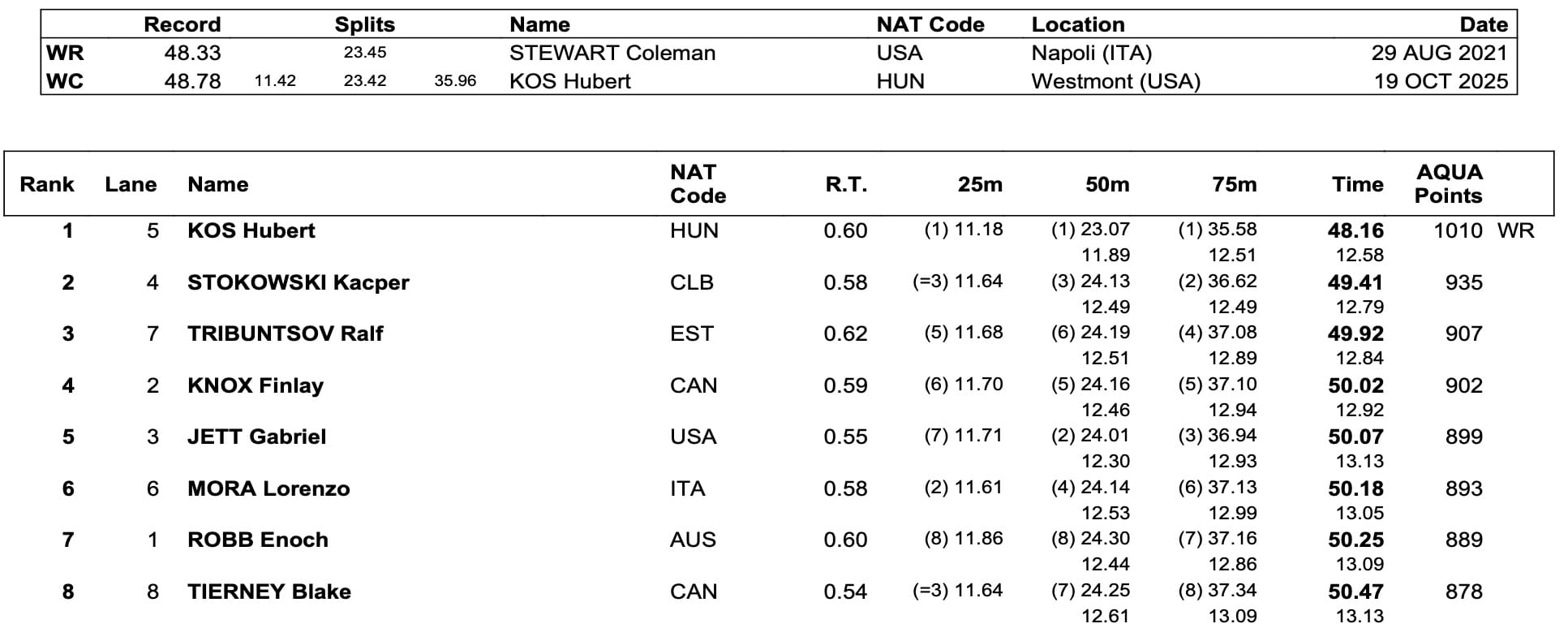 - 48.16 - 100m backstroke, Hubert Kós (HUN) axing 0.62sec off his week-old Cup record to take 0.17sec off American Coleman Stewart's 2021 standard - Final No6