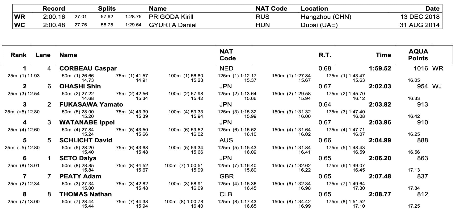 - 1:59.52 - 200m breaststroke, Caspar Corbeau (NED) becoming the first man ever to race inside 2 mins in the event, his time confining to history the 2:00.16 of Kirill Prigoda in 2018. And home in second, Japan's 16-year-old Shin Ohashi took down the World junior record in 2:02.03 for his third global youth - Final No7