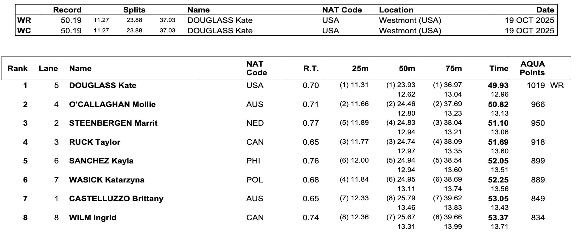 - 49.93 - 100m freestyle, Kate Douglass (USA) becoming the first woman ever to race inside 50sec in the event, her time 0.26sec faster than the standard she set 6 days ago at the second of the three Cup rounds to better Aussie Cate Campbell's 50.25 from 2017. - Final No8