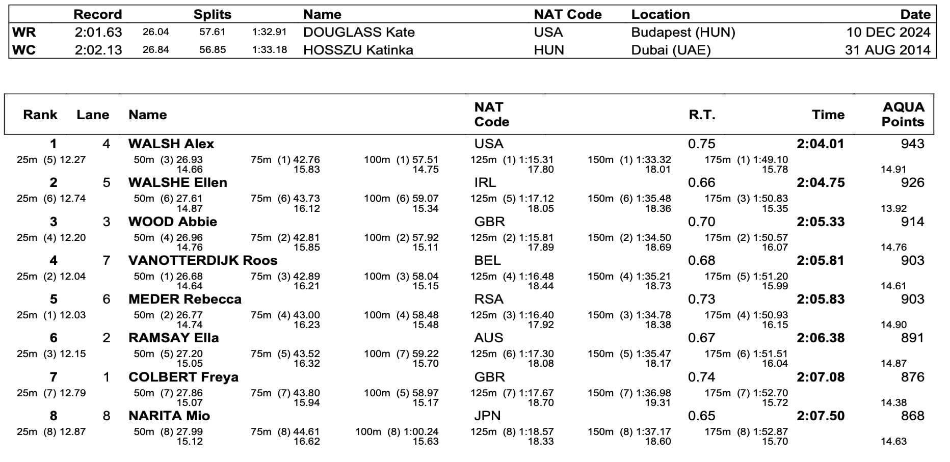 - Those phenomenal World-record swims, and the wave of national records that followed them on to the podiums - such as the vault of new standards established by Ireland's Ellen Walshe and Olympic bronze medallist Mona McSharry - and even, on a few occasions, fourth places, highlight the Cup tour's struggle to live up to its title in this sense: in the majority of finals, half the line-up did not make the 900-point mark.