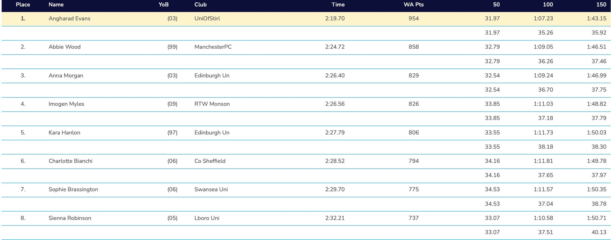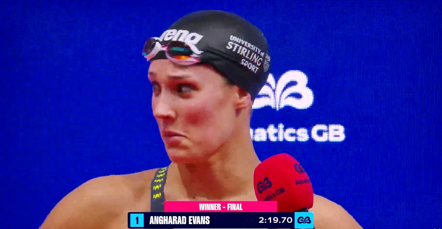 The clock stopped under 2:20 to take down the 2:20.89 British mark set by since-retired Mollie Renshaw in 2021. Evans' progress from a 2:21.86 at nationals a year ago made her the 4th European inside the barrier, and the 11th all-time to go that way globally since American Rebecca Soni pioneered the feat in 2:19.59 for Olympic gold at London 2012.