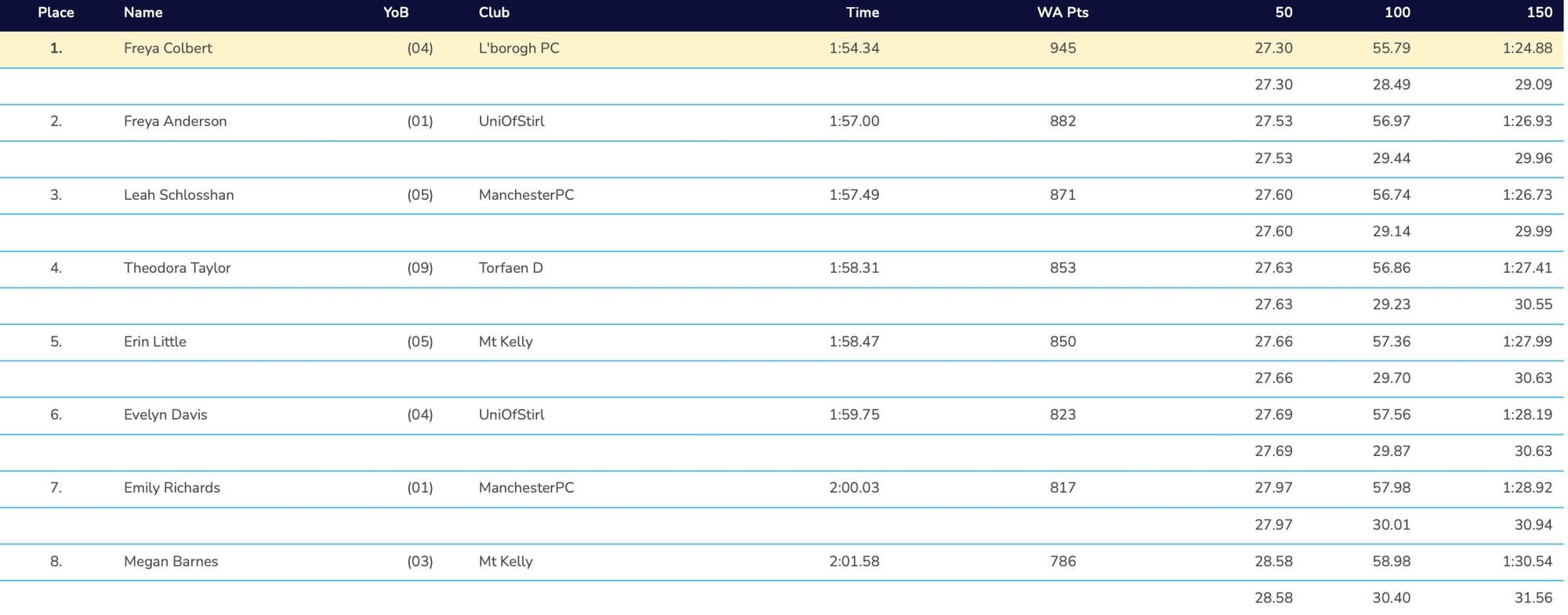Freya Colbert had the win in the bag by the half-way turn on 55.79, and by the last turn, on 1:24.88 was in a league of her own and looking set to break the British record for a third time mince last summer.