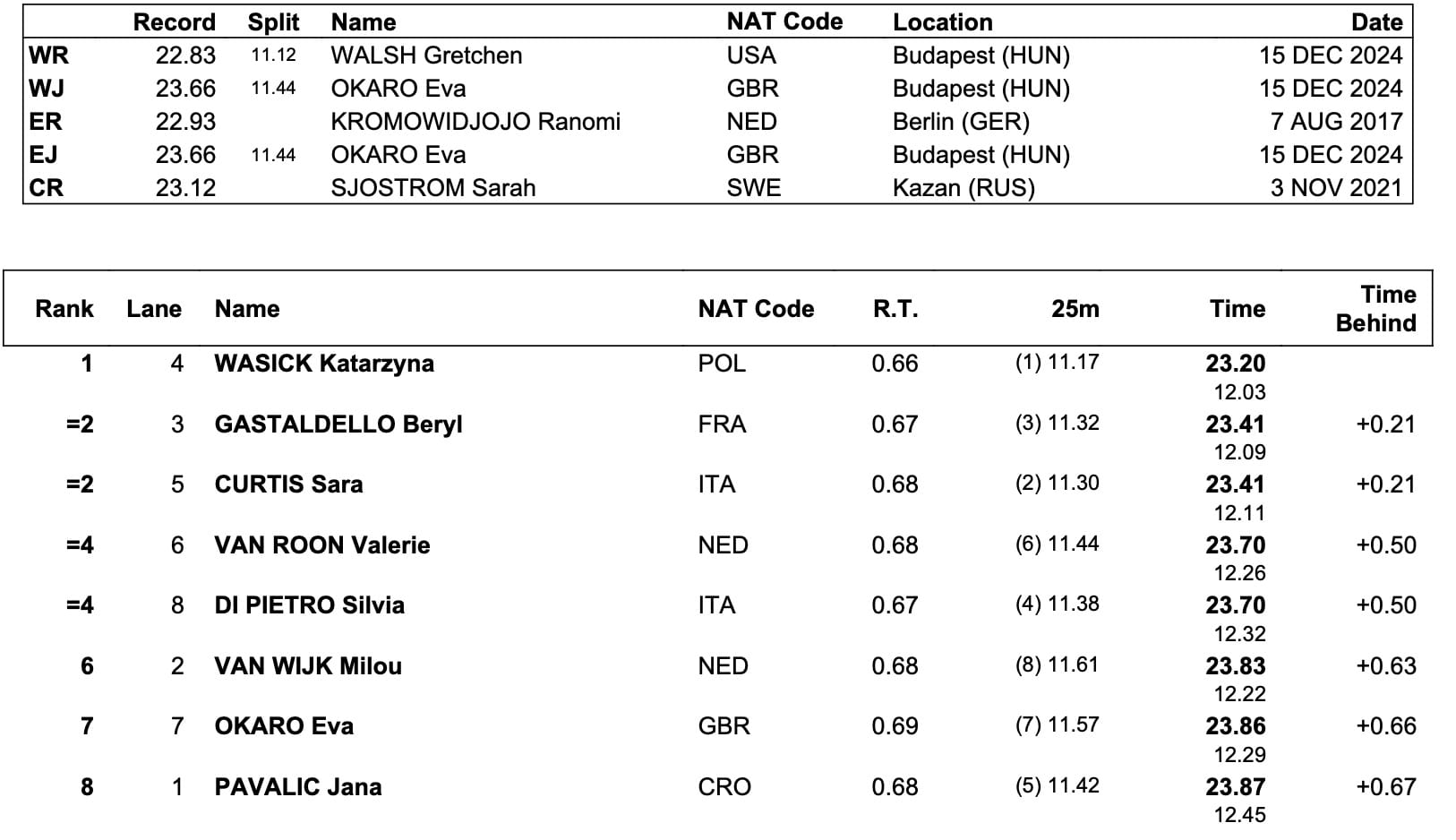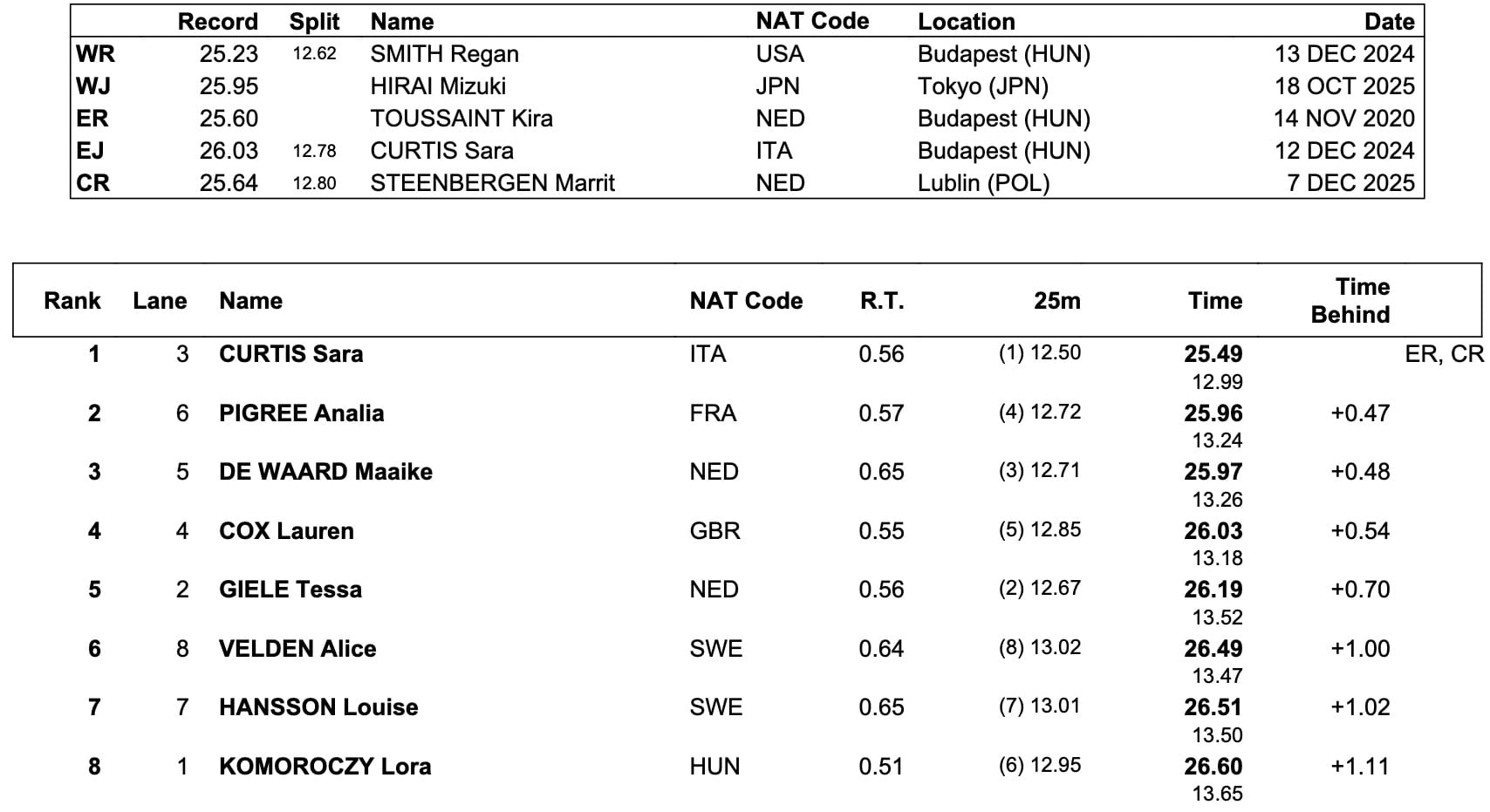 Curtis would have won it with her heats time: she clocked a career best of 25.97 in heats, a year after a 26.03 World Junior record in her semi-final at World s/c Championships in Budapest.