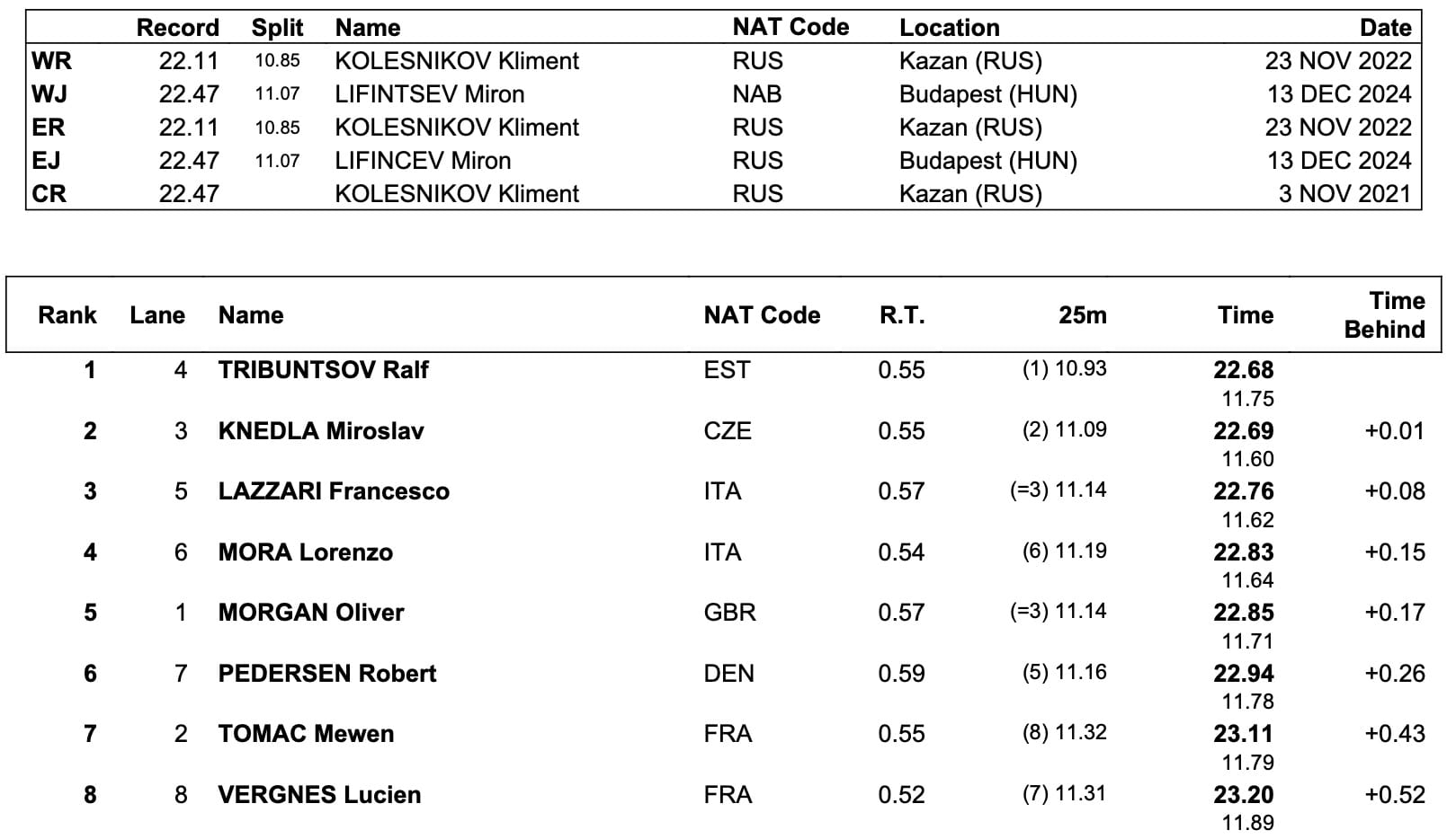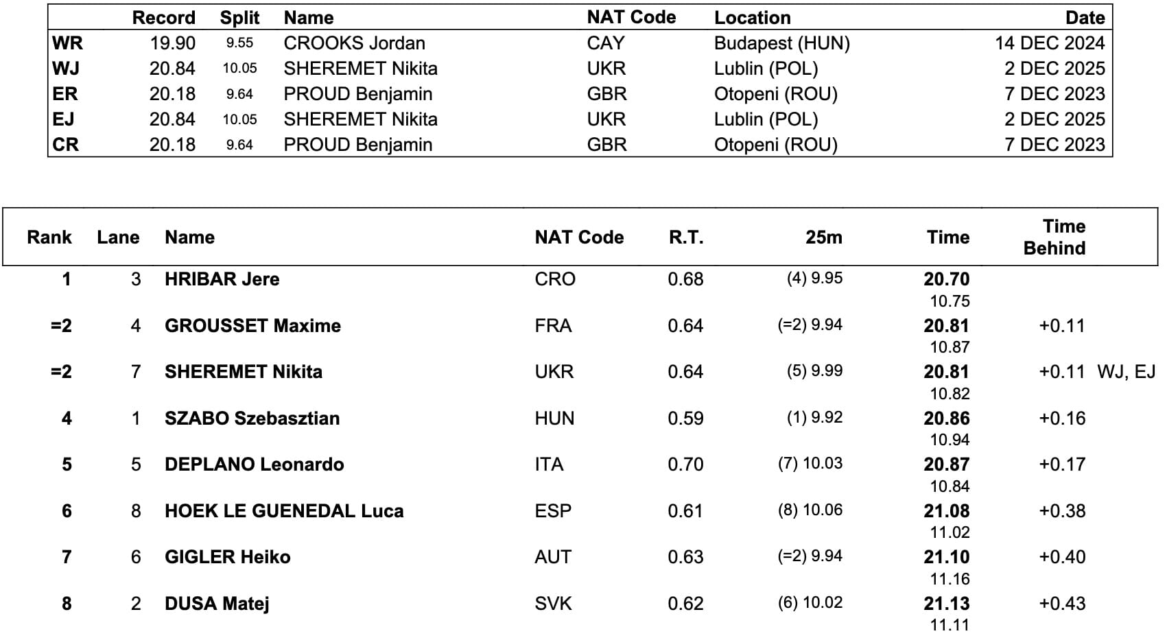 Jere Hribar, of Croatia, took the 50m free title in 20.70, 0.11sec ahead of a snap for silver, the only difference on the clock between France's Maxime Grousset and Ukraine's Nikita Sheremet was their age: for Sherement, 20.81 meant a second World Junior record this week, 0.03sec inside the time he clocked leading off his nation's 4x50 relay on day 1.