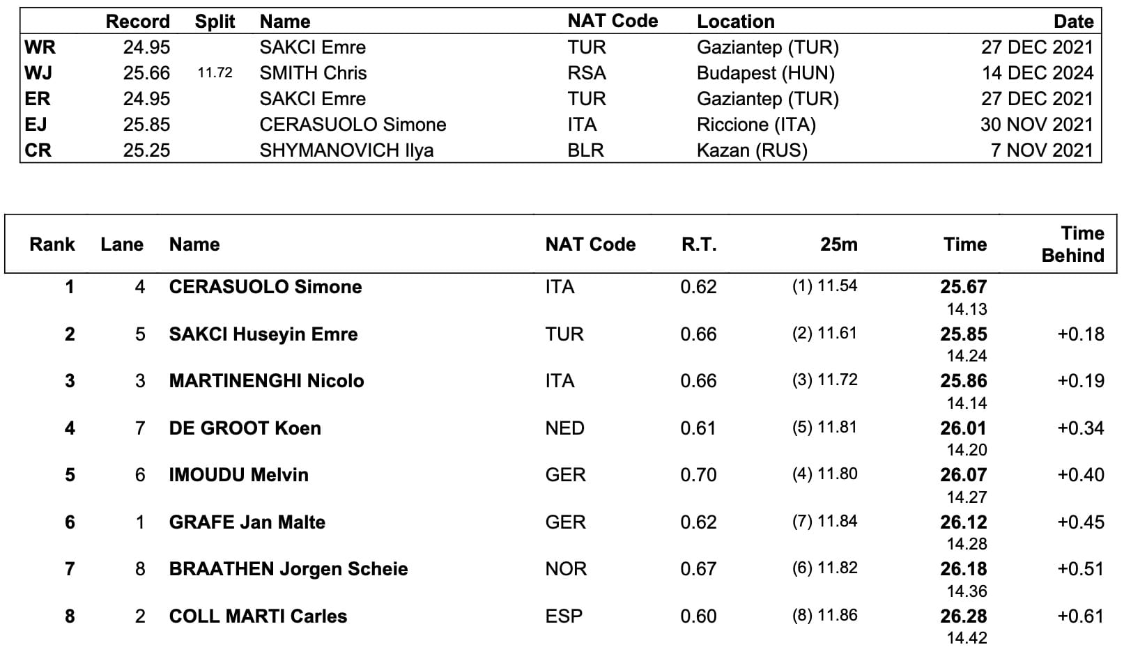 The new Euro mark took Curtis inside the respective standards set by Dutch sprinters Kira Toussaint in 2020, on 25.60, and Marrit Steenbergen, who clocked 25.64 in heats and left it there, with an eye on a sixth gold in six days of racing in the curtain-closing women's 4x50m medley relay with teammates.