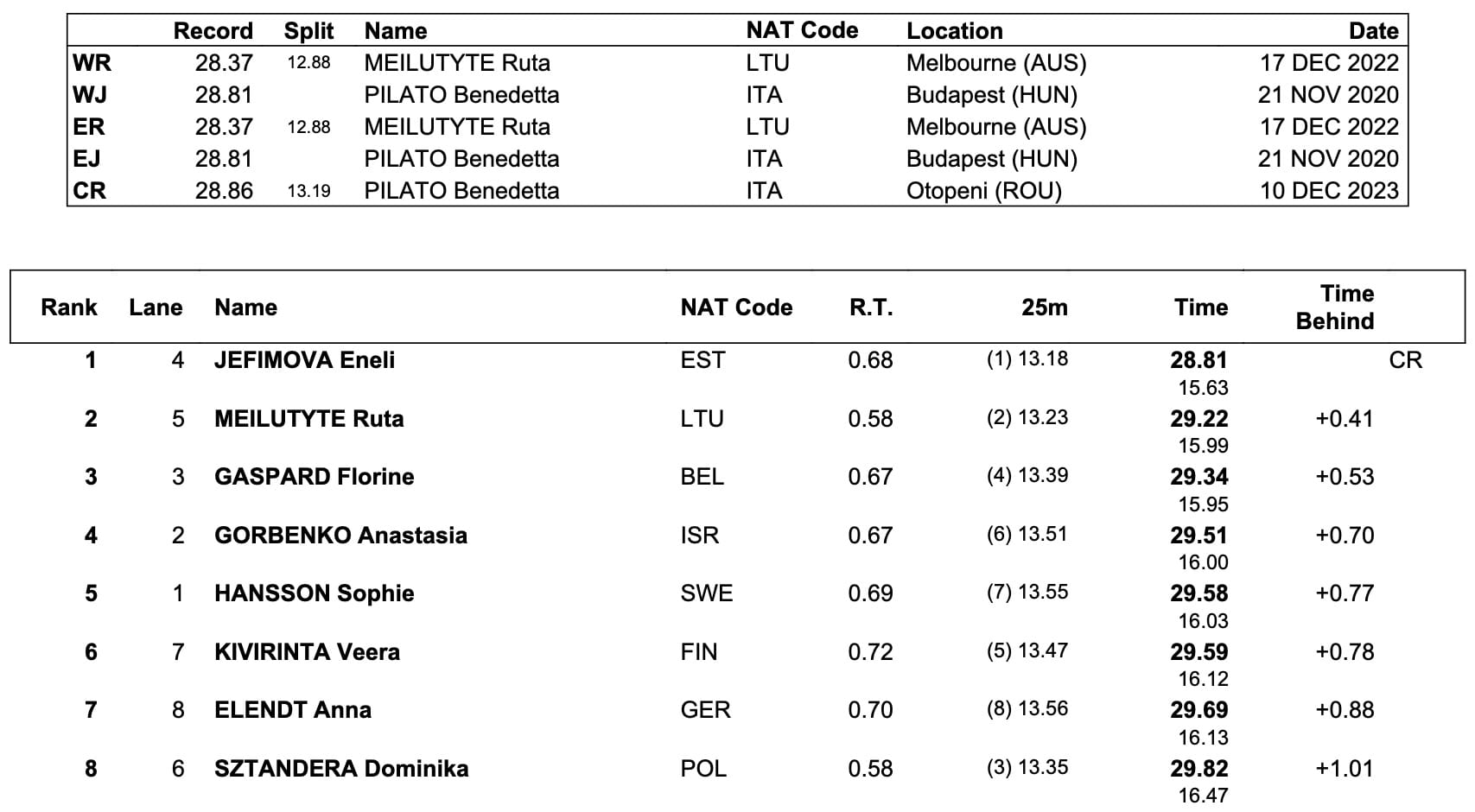 The second meet mark of the evening fell to Estonia's Eneli Jefimova in 28.81 in the 50m breaststroke, 0.05sec inside Ruta Meilutyte's 2023 championship record and 0.41sec ahead of her closest rival and a Lithuanian breaststroke pioneer who was 15 and based in Britain when she claimed Olympic gold in the 100 at London 2012. Bronze went to Belgium's Florine Gaspard in 29.34: