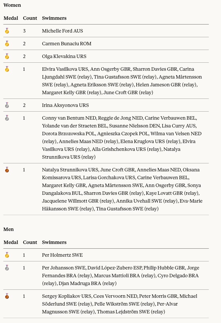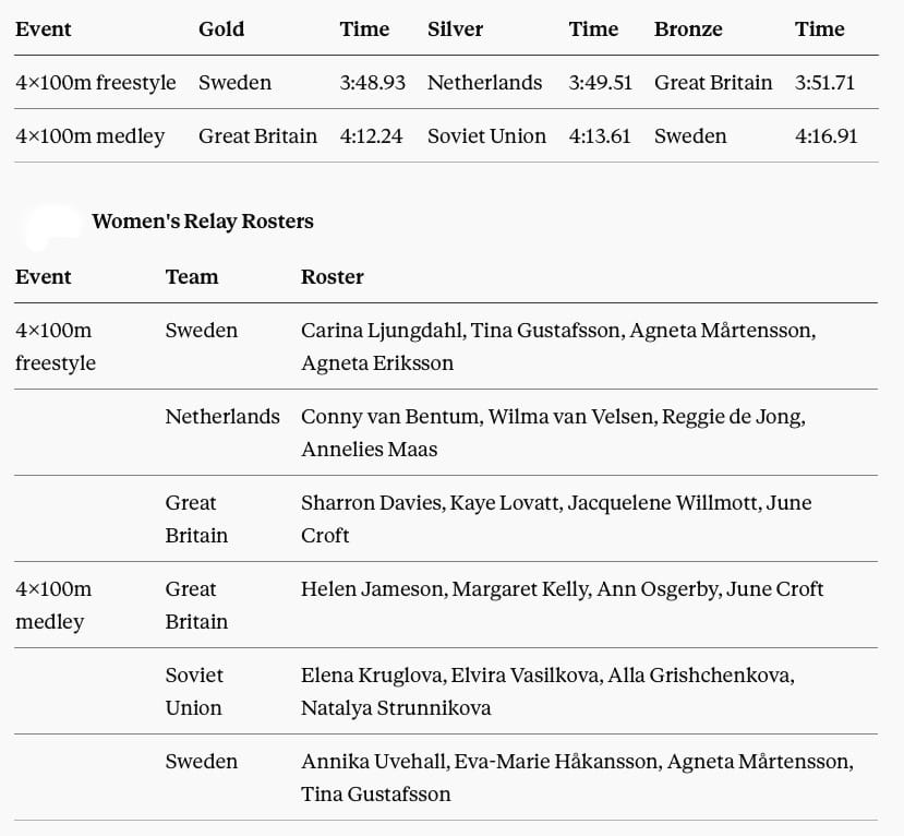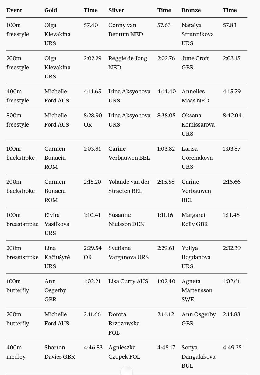 As our table suggests, there would have been three golds, not one, for Michelle Ford (AUS), and champion status, too, for Carmen Bunaciu (ROU), Olga Klevakina (URS), Ann Osgerby (GBR), Elvira Vasilkova (URS), Sharron Davies (GBR, and long-time campaigner for justice), and the quartets of Carina Ljungdahl, Tina Gustafsson, Agneta Mårtensson and Agneta Eriksson (SWE); and Helen Jameson, Margaret Kelly, Ann Osgerby and June Croft (GBR), as well as Per Holmertz (SWE).