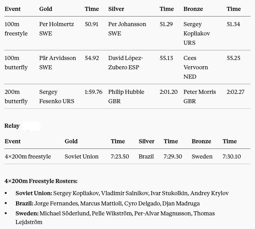 There's also a great deal more to celebrate for Sweden, Great Britain, the Netherlands, Romania, the women of the Soviet host nation, and Poland. Yes, the boycotted Games went ahead without swimming force the United States, but that is not the fault of any athlete, and should never prevent us from celebrating the achievements of those who did compete, recognising what happened, the truth underpinning the official outcome, including honours denied by proven and well-documented fraud backed up by court-room and other forms of confession(s).
