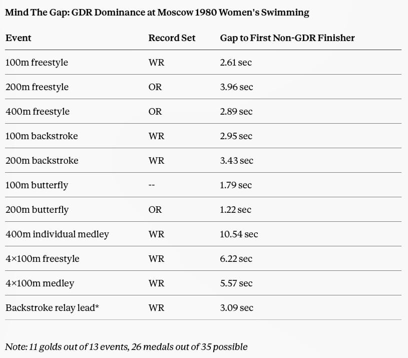 - Moscow was a Games at which GDR women's swimmers claimed 11 out of the 13 golds and 26 medals in total out of a possible 35 medals available to any one country. The gap from gold to first no-GBD swimmer home is gulf-like, as our Mind The Gap table below shows.