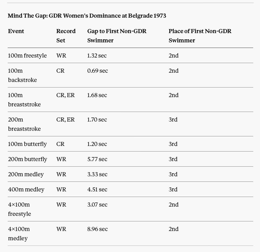 Those margins and the list of events, including all 100m finals and three out of five 200m finals, reflect the nature and timing of the GDR experiment: State Research Plan 14:25 would not become an official state secret until the year after swimming's first World Championships in 1973, but the impact of what was already underway and had been in some sports since the 1960s was clearly on display.