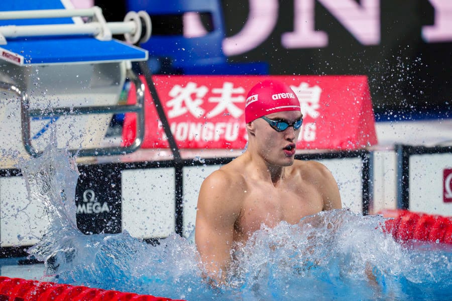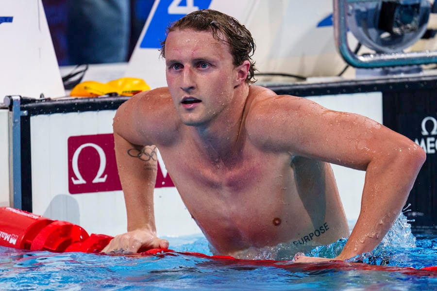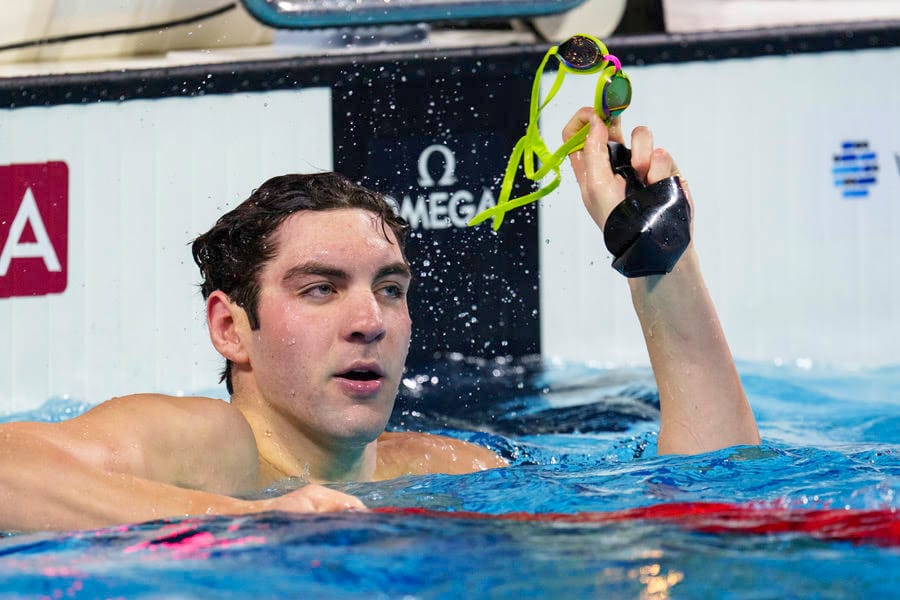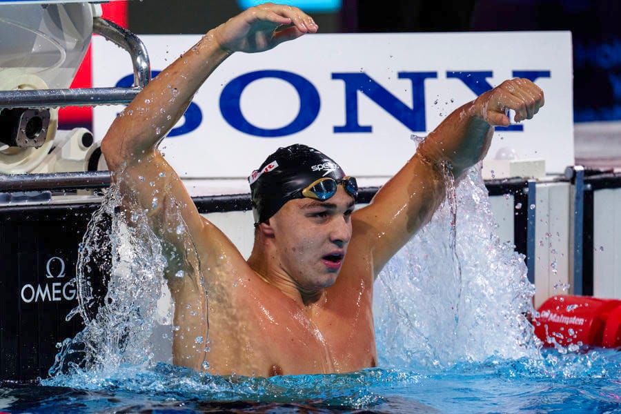 Gretchen Walsh led a 100m free podium that placed 3 new entries in the all-time top 10, with France’s Beryl Gastaldello and Kate Douglass, also of the USA. Jack Alexy takes men’s 100 free for USA, while Walsh was back in action later, for a 55.71 WR in the 100 ’fly semis