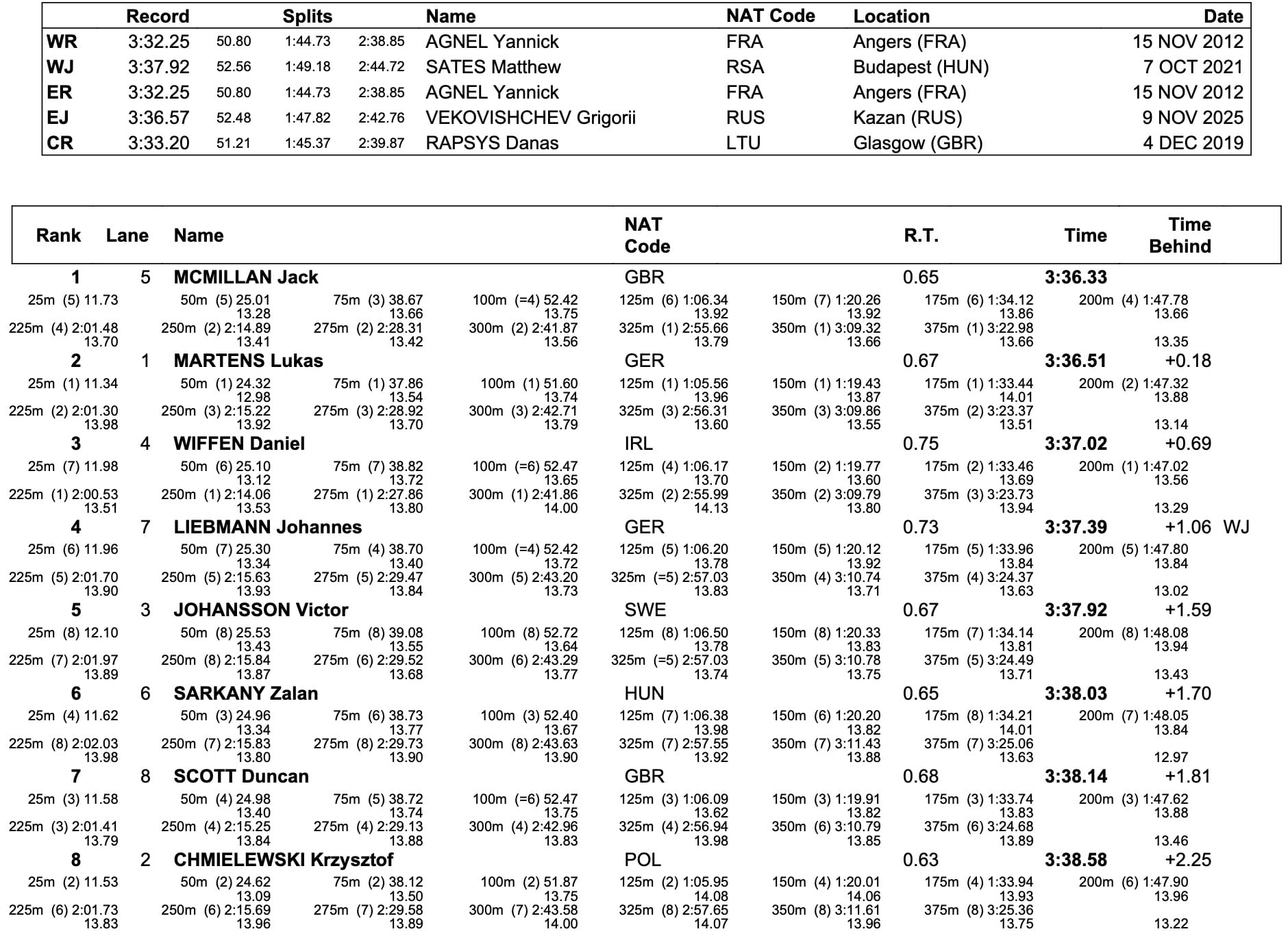 Gose's training partner and former boyfriend, the reigning Olympic and World 400m champion Lukas Märtens - the man who took down Paul Biedermann's World shiny suits record and Ian Thorpe's textile global standard in April this year - led to half way in Lublin this evening before Ireland's Dan Wiffen, Olympic 800m champion, took the helm to unit Britain's Jack McMillan had his feet on the wall first for the first time at 325m and then refused to give way on his way to the first international senior crown of his career.
