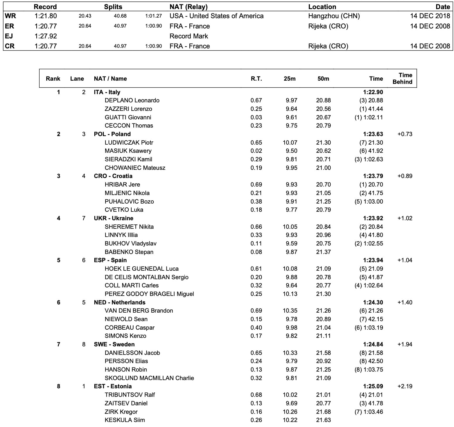 In semi-finals, Noe Ponti, of Switzerland, set a championship record of 21.51 (compared to his World record 21.32) in the 50 butterfly; Dutch title hope Caspar Corbeau clocked 55.77, after a Dutch mark of 55.54 in heats, to leave the way to the 100m breaststroke showdown tomorrow.