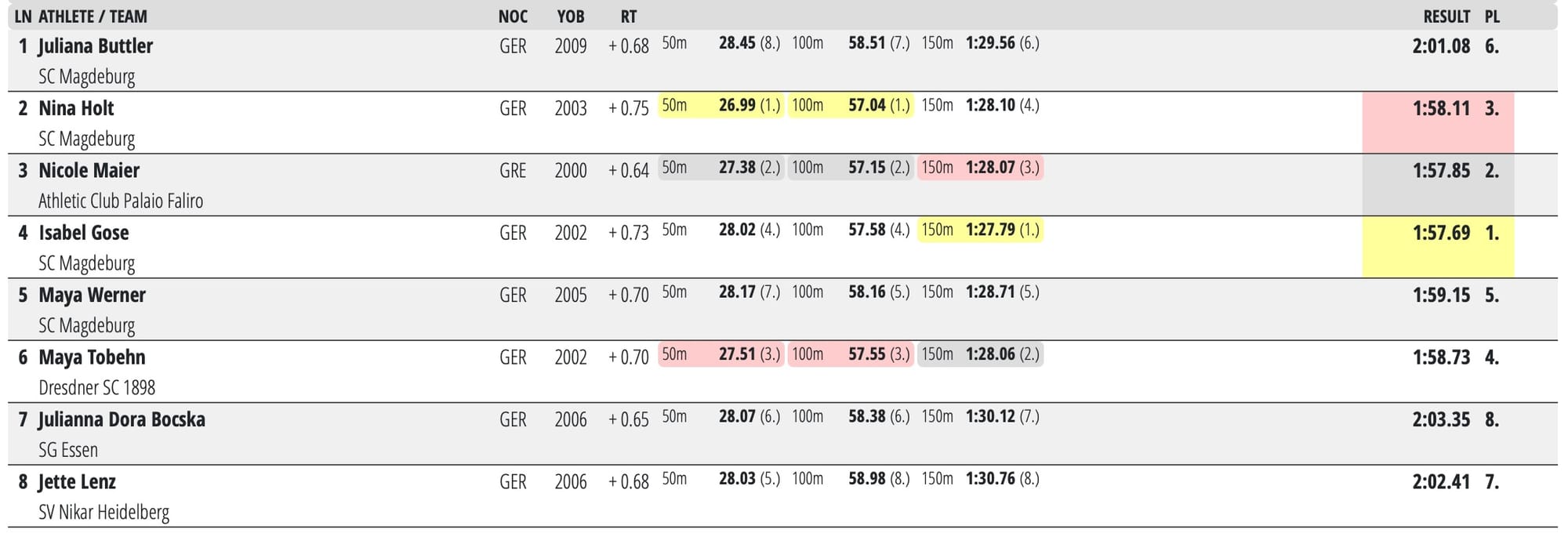 The race behind them was all about 4x200m berths for Paris: Nina Holt (1:58.11), Maya Tobehn (1:58.73), and Maya Werner (1:59.15) made the cut, but now selectors have a choice to make as part of what some may see as an over-complicated selection process.