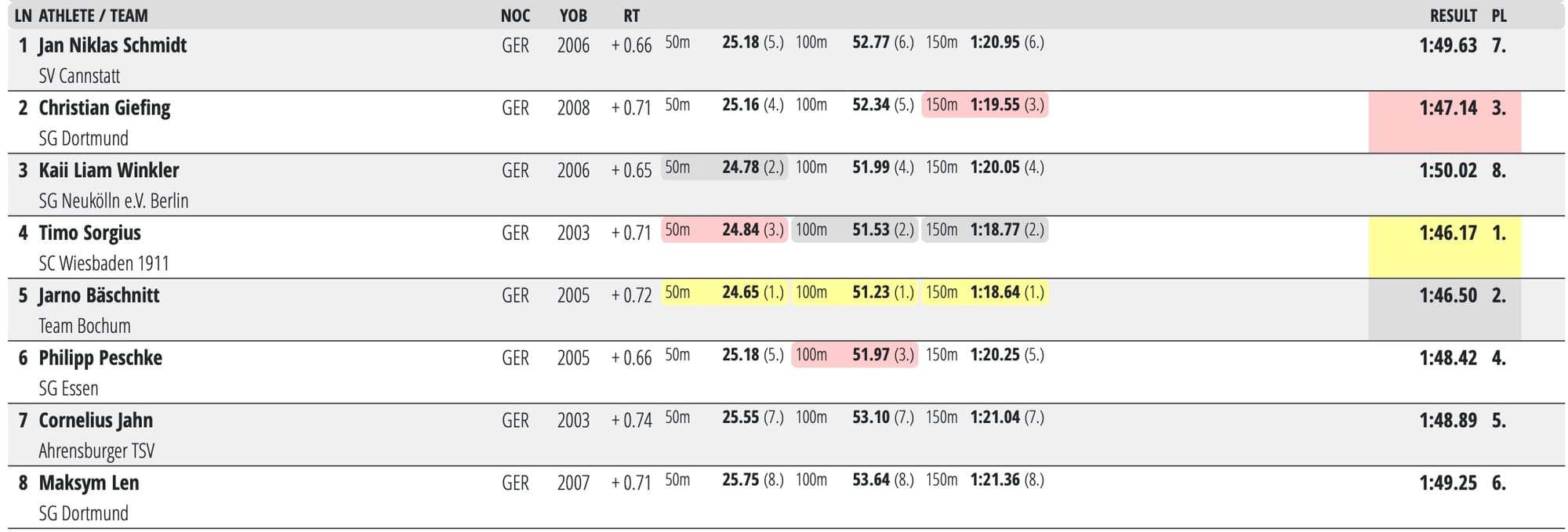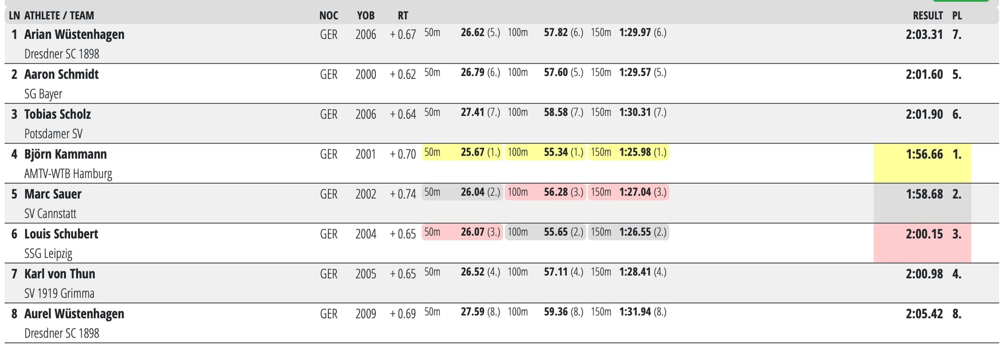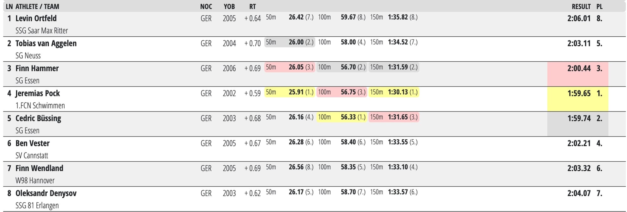 Jeremias Pock broke the two-minute barrier for the first time in heats, and then repeated the feat to retain the German crown in 1:59.65, a few tenths slower than his morning swim but good enough to keep 400 medley champion Cedric Büssing at bay, 1:59.74 good for silver, Finn Hammer taking bronze in 2:00.44, all three under the European cut. =
