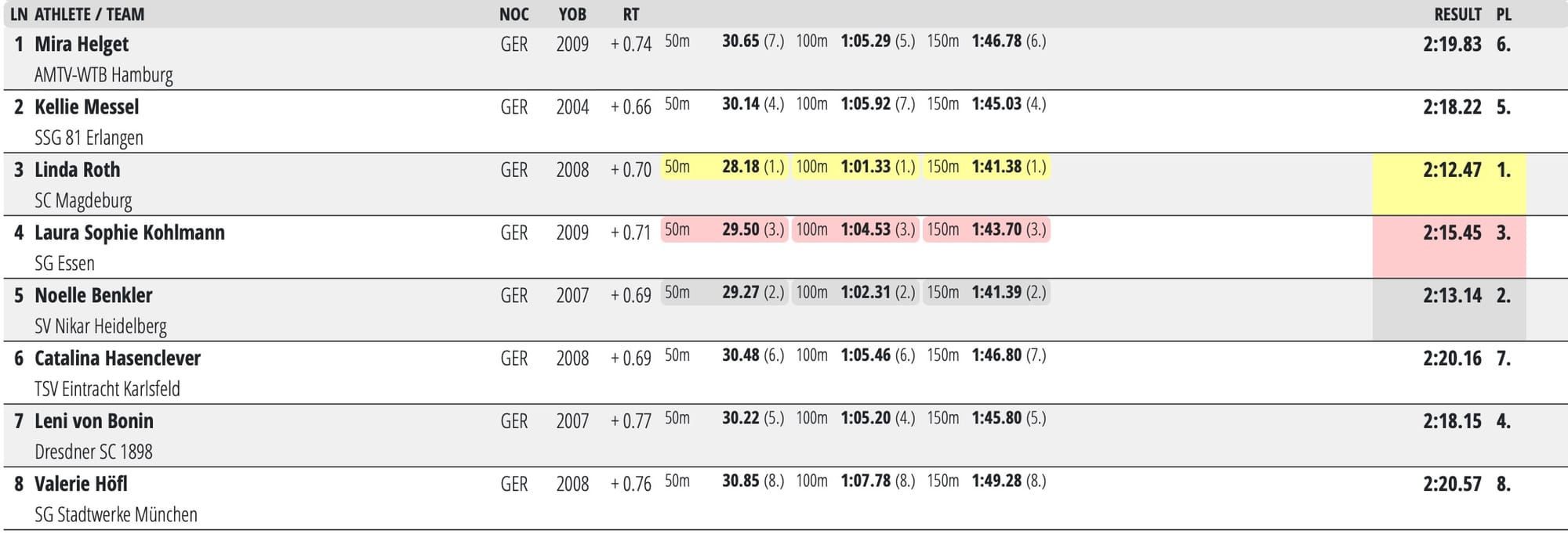 Linda Roth, of Magdeburg, grabbed a ticket to Paris in 2:12.47 a stroke ahead of ahead of Noelle Benkler, who clocked 2:13.14 but had already swum faster in a previous qualification event. Laura Sophie Kohlmann took bronze in 2:15.45.