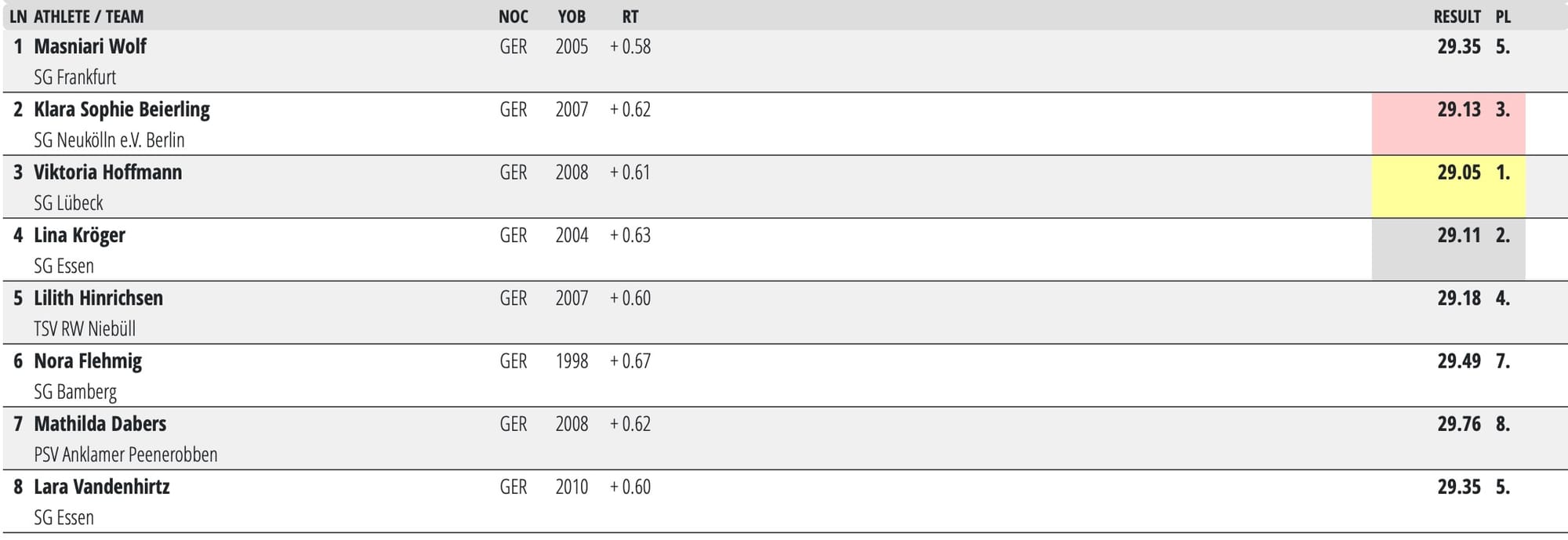 Viktoria Hoffmann, from Lübeck, grabbed gold in 29.05 seconds, just 0.06 ahead of Lina Kröger, with Klara Sophie Beierling just 0.02sec further adrift for bronze.