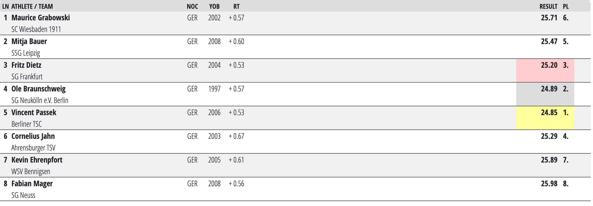 Vincent Passek pipped his Berlin training partner Ole Braunschweig 24.85 to 24.89. Braunschweig focused exclusively on the backstroke dash at nationals for his silver lining. The bronze went to Fritz Dietz in 25.20, while Cornelius Jahn, on 25.29, may also get the call for Paris action.