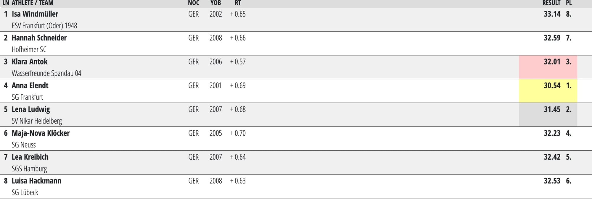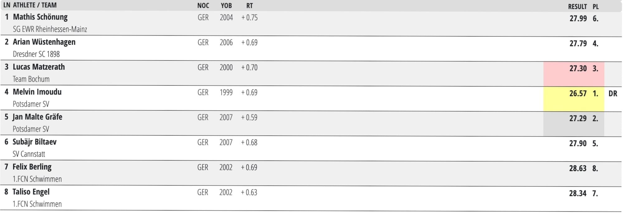 Junior world record holder Malte Gräfe slotted in between the two seniors, his 27.29 also inside the European Championship qualifying standard. The German team will be confirmed after the last qualification event before the Paris showcase, with each nation able to select up to four swimmers per event should they wish.
