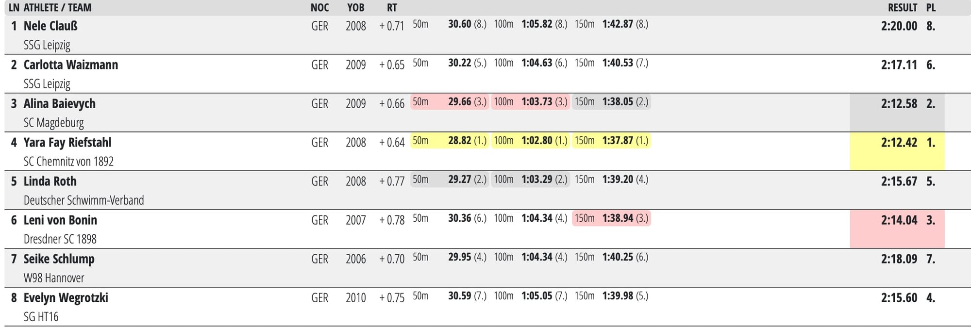 Chemnitz teenager Yara Fay Riefstahl, 17, took her first German senior title in a thriller with Alina Baievych that ended 2:12.42 to 2:12.58. Both narrowly missed the U23 qualifying standard for the European Swimming Championships in Paris. Defending champion Leni von Bonin (2:14.04) completed the podium.