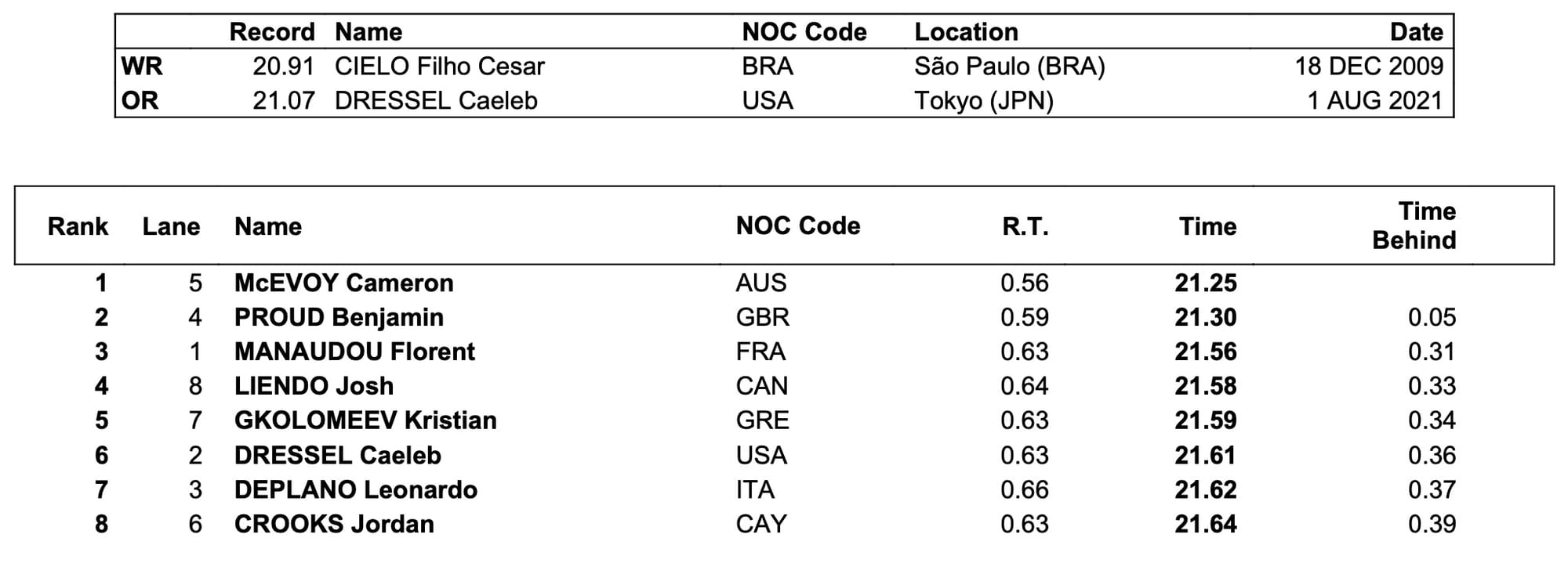 Canadian Josh Liendo was just 0.02sec shy of the medals, in 21.58, 0.01sec ahead of Greece's Kristian Gkolomeev, defending champion, Caeleb Dressel, of the USA, sixth in 21.61.