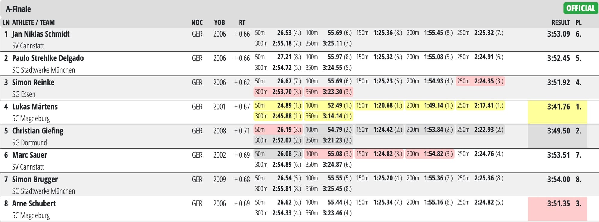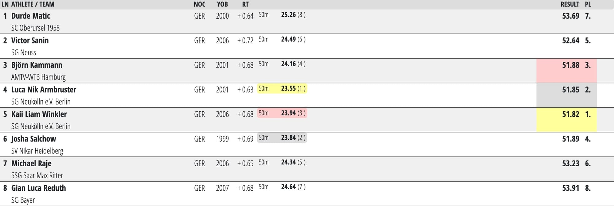 Just 0.7 separated the top four home: Kaii Winkler took the title in 51.82, followed by defending champion Luca Armbruster (51.85), Björn Kammann (51.88) and Josha Salchow (51.89). All four made the Paris cut but it was Armbruster who secured a spot on the German medley relay for Paris, as the man with the fastest average time from heats and final, which looked like this: