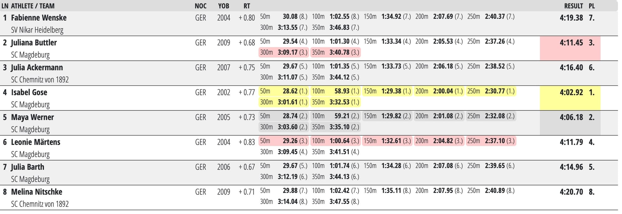 Isabel Gose maintained her dominance of Germany's distance events with a 4:02.92 win ahead of Magdeburg teammate Maya Werner, on 4:06.18 after having shadowed her training partner to the 100 and 200m marks: