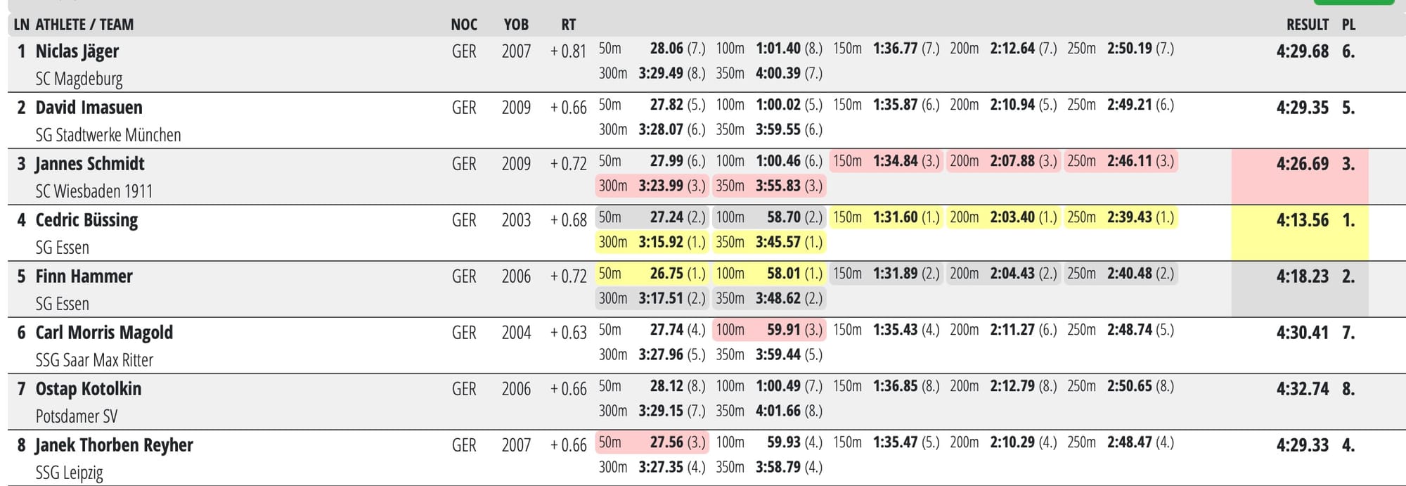 Third-placed Jannes Schmidt, who was born in 2009 - the years Paul Biedermann (and a shiny suit) set thumping world records to claim the 200 and 400m free World titles in Rome, clocked 4:26.69for a European Junior Championships cut.