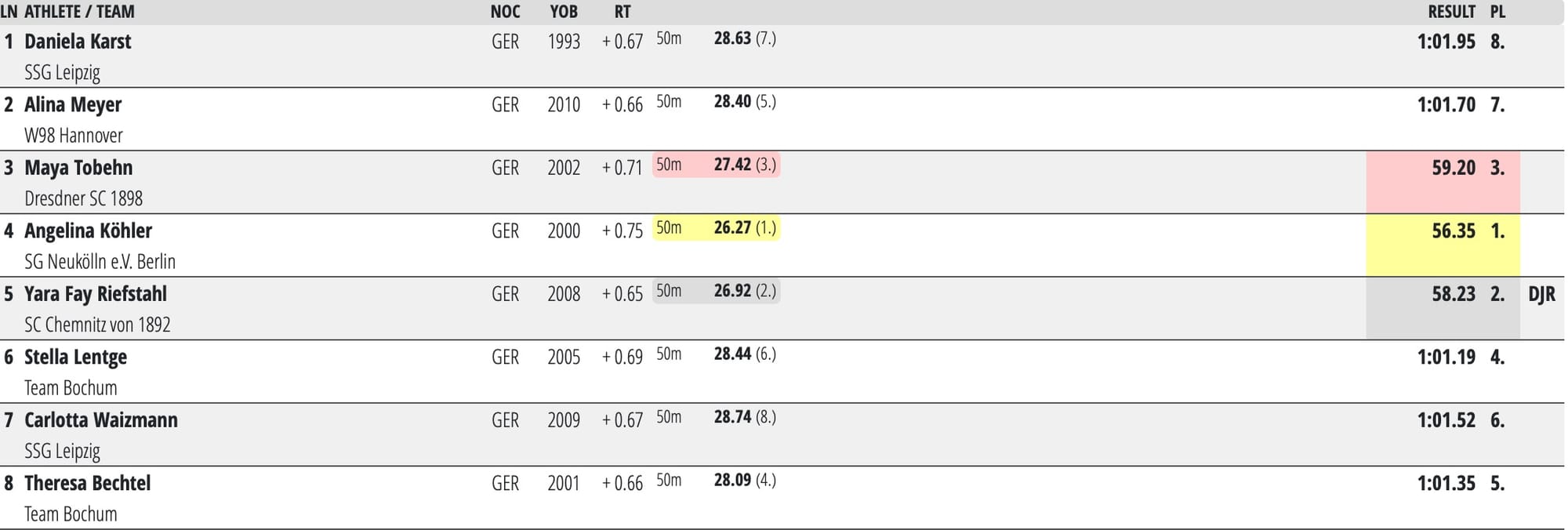 Yara Fay Riefstahl, of Chemnitz and born in the year Britta Steffen claimed Olympic gold in the 50-100m freestyle (2008), set a German junior record of 58.23 for second place. Her 50m split a 26.92.