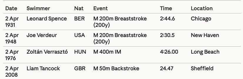 Similarly, the other two standards set on April 2 in history, have connections, in that Zoltán Verrasztó, was, like Liam Tancock, primarily known as a backstroke swimmer. Indeed, Verrasztó was reigning World 200m backstroke champion (1975) at the time he set the 400m medley record in 1976.