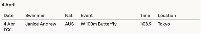 On this day in 1961, Australian Jan Andrew took down the World record in the 100m butterfly with a 1:08.9 in Tokyo.