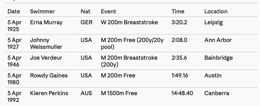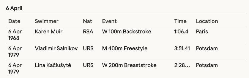 On April 6 in history, World records were set in the pool by Karen Muir, a South African denied a shot at Olympic gold by her country's apartheid regime and the ban it brought on, and two Soviet Olympic champions in waiting, Russian Vladimir Salnikov and Lithuanian Lina Kačiušytė: