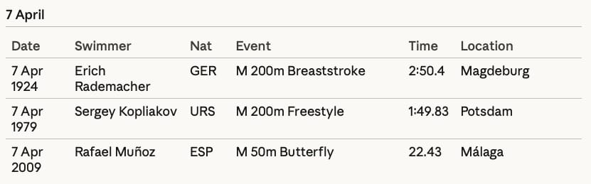 The battle of 1980 began in 1978: in April, Bogdanova broke Koshevaia’s world record by 0.03sec, in 2:33.32; in August, Kachushite, 15, swam 2:33.11 in heats and 2:31.42 to claim the world title ahead of Bogdanova; on March 30, 1979, Varganova clocked 2:31.09; seven days later, on this day in history - April 7, 47 years ago, Kačiušytė settled the argument with a then-phenomenal 2:28.36, the first sub-2:30 in history and a mark that survived for six years and two months.