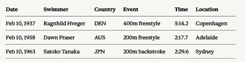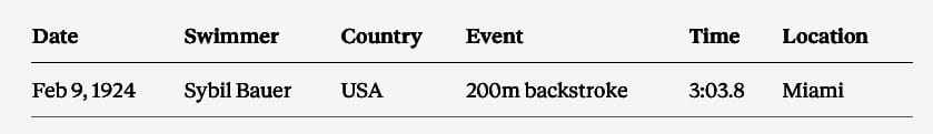 On this day, February 9, in 1924, 18-year-old American Sybil Bauer set the second of her two 200m backstroke World records - the first two official standards in the event: