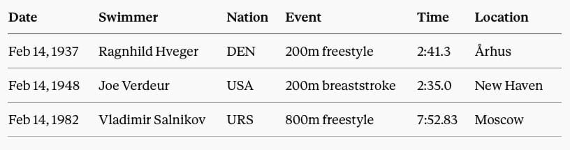 On this day in history… World records were set by Ragnhild Hveger, Joe Verdeur and Vladimir Salnikov.