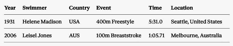 - 2006 - Leisel Jones (AUS) took the pace of the women's 100m breaststroke below 1:06 for the first time, on 1:05.71 at the Australian Championships in Melbourne