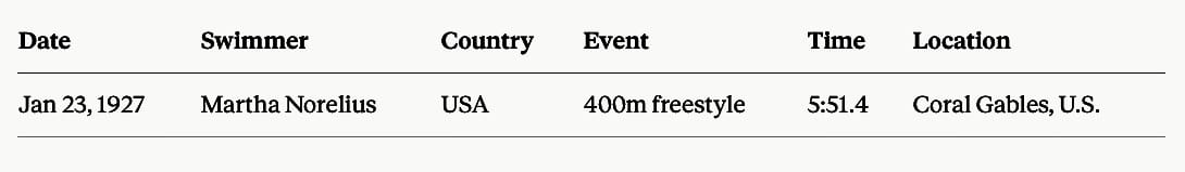 Timeline - The SOS Daily Trawl of World long-course records set this day throughout history. On this day in 1927, Martha Norelius - between 1928 & 2024 the only woman ever to win back-to-back Olympic 400m free titles, set one of her 19 World freestyle records