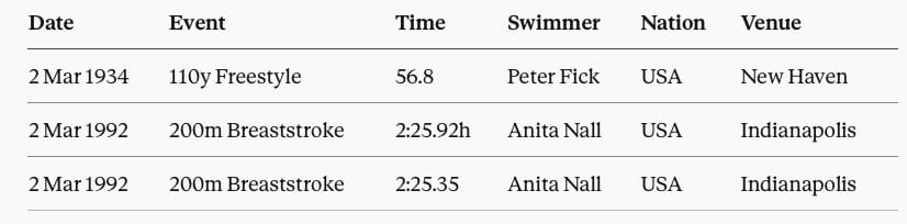A few months later, aged 16, Nall hauled gold, silver and bronze medals at the 1992 Olympic Games in Barcelona, her medley relays victory with USA teammates delivered in World record time. Her story is heading into our SOS Hall of Fame, alongside that of Peter Fick, who sent the last of his three world records over 100 free on this day back in 1934, and many others.