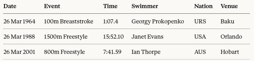 March 26, 2001: Ian Thorpe, of Australia, is best known for his Olympic golds in the 200 (2004), 400m freestyle (2000 and 2004), 4x100m free (2000) and 4x200m free 2000). He also claimed silver in the 200m free in 2000 and a bronze in the 100m in 2004. Less well remembered beyond his sport are his pioneering World records over 800m freestyle - one of which, the first sub-7:40 in history, was set almost 25 years ago. Thorpe clobbered Kieren Perkins' 7:46.00 global mark, set on his way to the 1500m free World record at the 1994 Commonwealth Games in Victoria, Canada, with a 7:41.59 pin this day a quarter of a century ago at the Australian Championships in Hobart to set up a class of titans with teammate Grant Hackett at the World Championships later that same season and year.