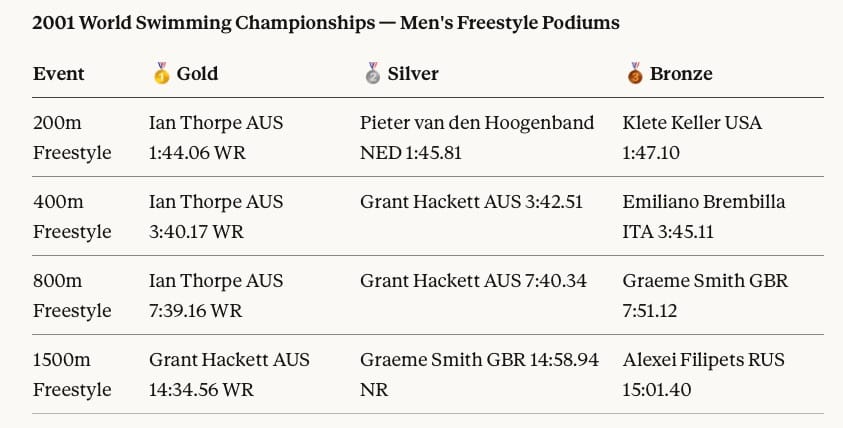 What thrilling times those were, lucky all we who witnessed the Fukuoka 2001 Worlds as the young Aussie giants pressed the pace and made each race an epic: every gold 200 to 1500m took a World record to win.. The 800m delivered gold for Thorpe in the first sub-7:40 in history - and a 200-400-triple for him, too. In the 1500, Hackett was in a class of his own, his efforts and those of Thorpe contributing to the first Australian defeat of the USA on gold-medal count in World-Championship history - and Britain and Scotland's Graeme Smith on the podium in both the 800 and 1500m: