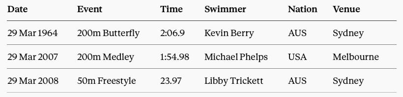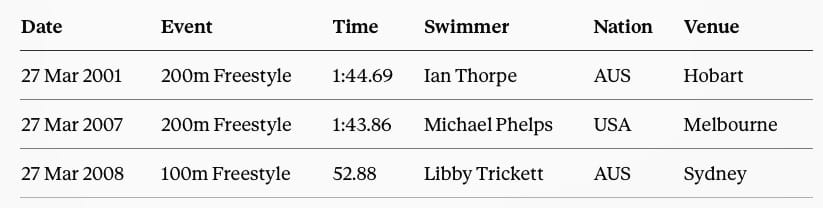 And talking of the 200m free, March 27 marked the day when that event saw two of the greatest four-length swims ever: At the 2001 Australian championships in Hobart, Ian Thorpe took the pace of the event below 1:45 for the first time in history, with a 1:44.69 that broke the 1:45.35 in which the Eindhoven Express, Dutchman Pieter van den Hoogenband had steamed to Olympic gold ahead of the home favourite at Sydney 2000. That would be the last time Hoogie beat Thorpey over four lengths. The Australian's mark on March 27, 2001, was his fifth World record in the event, and the calm before the storm of his sixth: 1:44.06 for the world title in Fukuoka later that year.