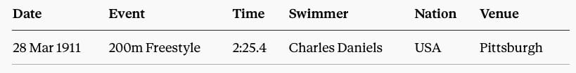 In between those date above, we go back to 1911 and find Charles Daniels, USA, wiping almost 5 seconds off the global 200m free standard with a 2:25.4 that confined the 2:30.0 of Australian Frank Beaurepaire, set 9 September 1910 in Exeter, in the United Kingdom. Daniels' mark would survive until fellow American Norman Ross clocked 2:21.6 on 24 November 1916, a mark that will celebrate its 110th anniversary later this year.