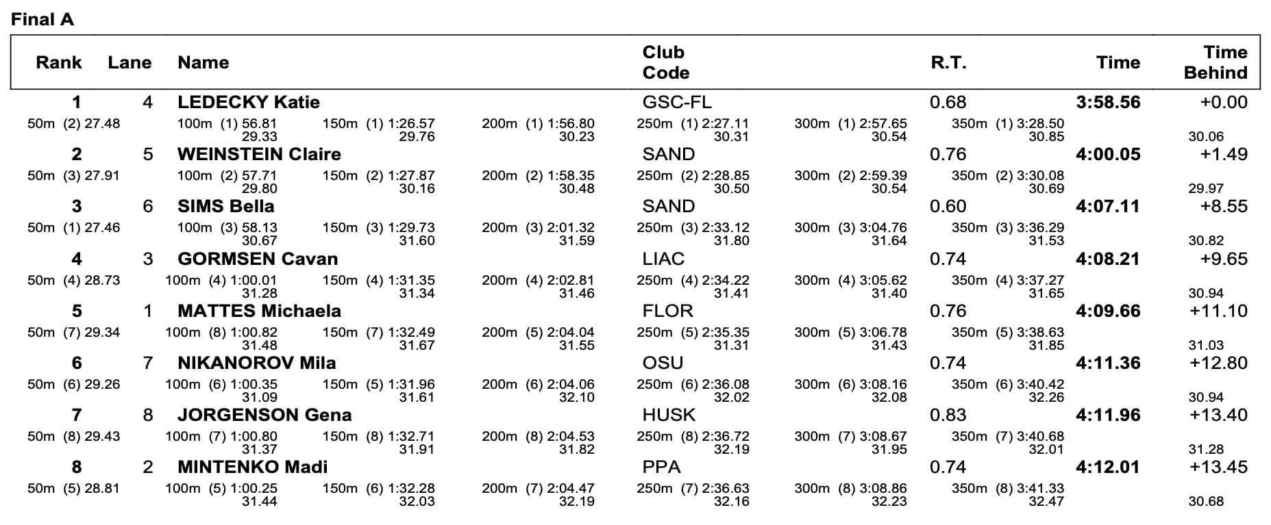 Smith was overhauled as American No 2 this evening when Claire Weinstein stopped the clock in 4:00.05, a frustrating 0.06sec shy of joining Ledecky in an American sub-4min club she's owned alone since 2013, the season of her World-title debuts over 400, 800 and 1500m: