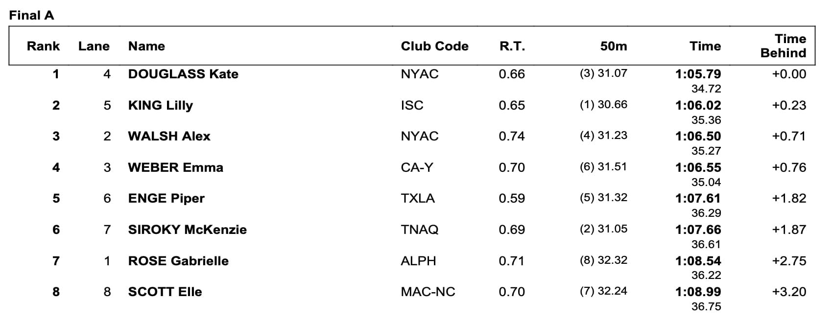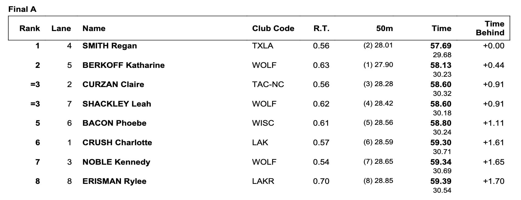 - Kaylee McKeown (AUS) 57.33 OR, =OC; Regan Smith (USA) 57.66; Katharine Berkoff (USA) 57.98.