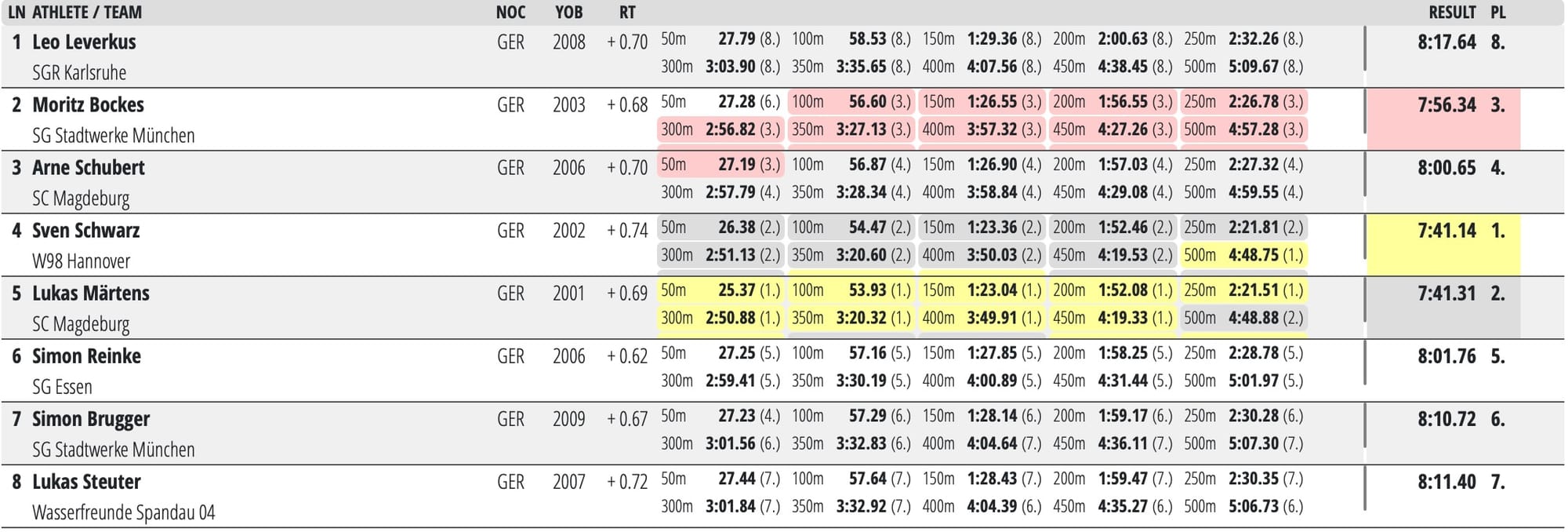Paris this August might see the fastest 800m freestyle line-up of swimmers - and heats swimmers at that - from one nation ever to be assembled in one championship pool after Sven Schwartz and Lukas Märtens battled to respective gold and silver in 7:41.14 and 7:41.31 over 800m freestyle at German Championships in Berlin this evening.