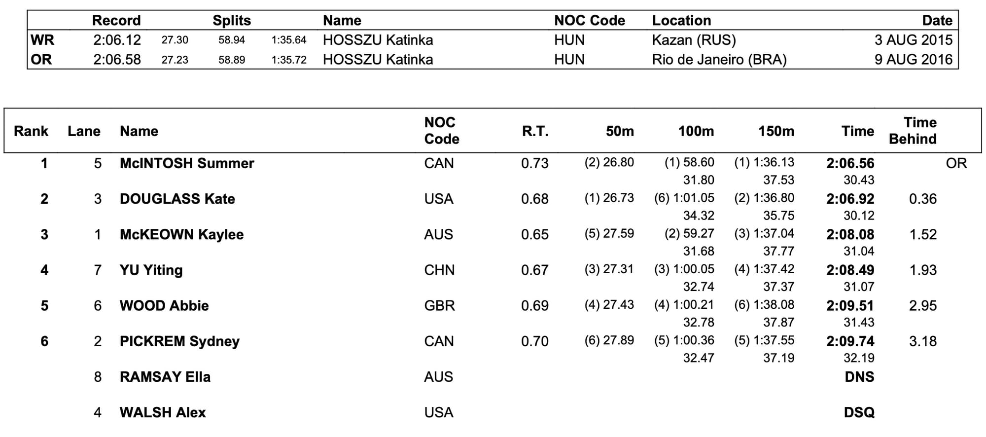 Walsh, who stopped the clock at 2:07.06, was disqualified for a faulty backstroke-to-breaststroke turn and forfeited the bronze, so the podium went McIntosh 2:06.56 Olympic record, Kate Douglass, the 200m breaststroke champion for the USA, 2:06.92 for silver, and Kaylee McKeown, the Australian who joined Roland Matthes in the backstroke Quad club yesterday, on 208.08.