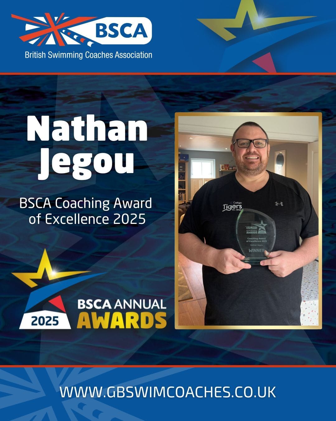 Jegou (Tigers of Jersey SC) was also awarded a BSCA Coaching Award of Excellence 2025, in recognition of his work in developing Filip Nowacki in Jersey, and recommending him to join a programme where he could develop to become the swimmer he has this year at both Junior & Senior levels. Yesterday, Keiron Piper was awarded the BSCA's Youth Coach of the Year for his work with the same swimmer, at Millfield (see that and other awards lower down in the Vortex.)